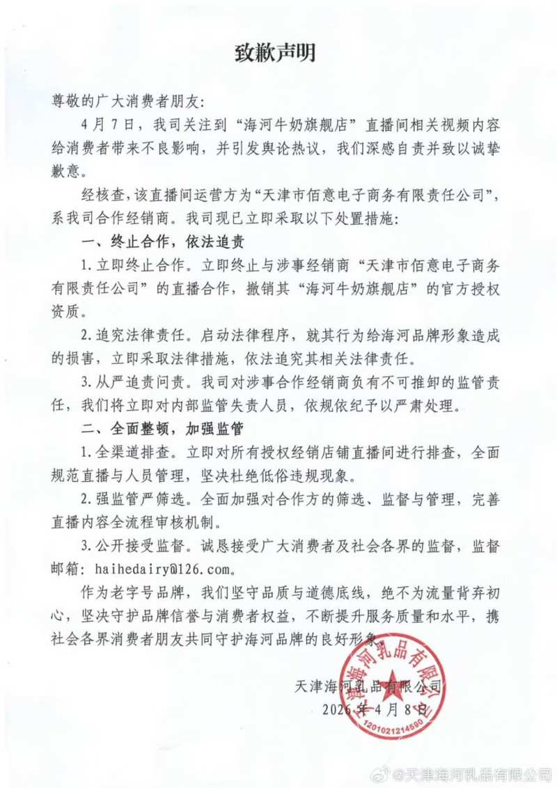 新京报贝壳财经讯(艳霞记者)4月8日,天津海河乳业有限公司(以下简称海河乳业)因“海河乳业旗舰店”直播间视频内容给消费者带来负面影响并引发舆论热议后,发布道歉声明。经海河乳业核实,该直播间运营者为该公司合作经销商天津百亿电子商务有限公司。海河乳业公布惩戒措施,立即终止与卖家天津百益电子商务有限公司的直播合作,并撤销“海河乳业旗舰店”的官方认证。公司已提起法律诉讼,并计划立即采取法律行动,调查公司行为对海河品牌形象造成的损害,并依法追究相关法律责任。凯河乳业表示:“我们公司对合作经销商负有严格的监管责任。我们将立即撤换内部监察负责人,并依规依纪采取严格措施。”据公开报道,前述直播间主播在直播过程中经常做出猥亵肢体动作,发表色情、粗俗言论,且言论内容极其令人反感。更正:王欣